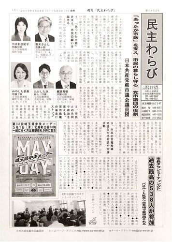※ 太字 は、蕨市独自の35人学級の対象となった学年 小中学校で入学式 独自の35人学級で行き届いた教育を 4月8日、市立小中学校10校でいっせいに入学式がおこなわれました。日本共産党の鈴木、山脇、梶原各市議とわたし宮下は、居住地学区内の小中学校へ来賓…